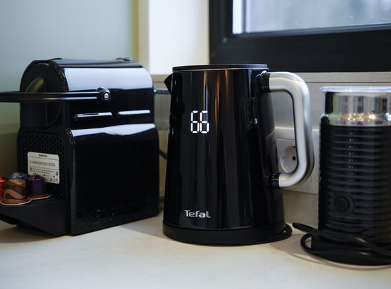 Nespresso kafijas mašīna, piena putotājs un kafijas kapsulas